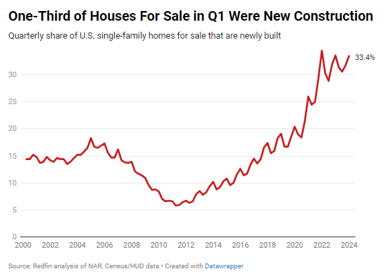 The U.S. housing market has undergone significant changes since the onset of the pandemic, with a notable shift towards newly built homes. As of the first quarter, a substantial 33.4% of single-family homes for sale were newly constructed. This figure remains consistent with the previous year and only slightly below the record-high 34.5% seen two years ago. Despite a slight decline, the proportion of new constructions in the housing supply is still about double what it was before the pandemic.